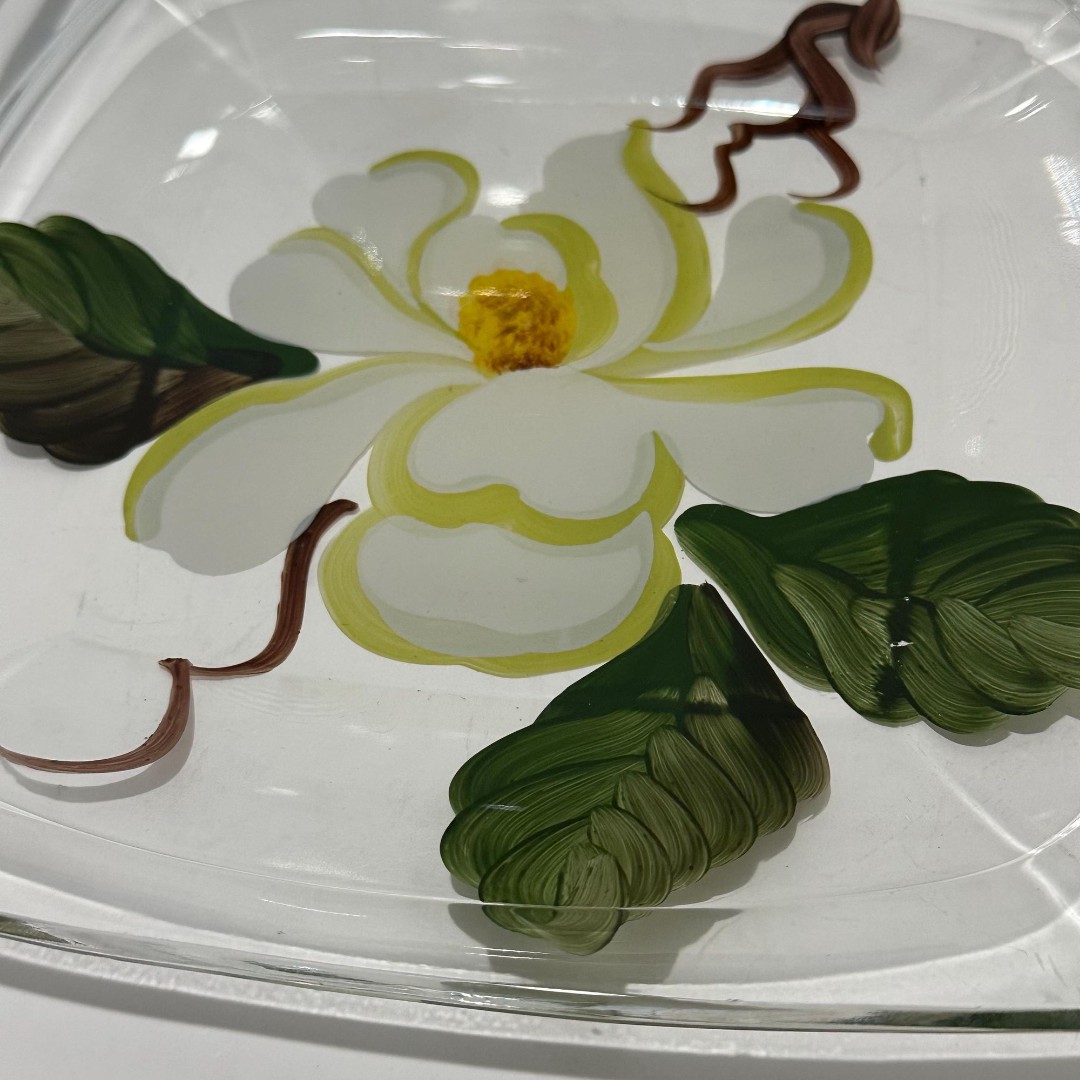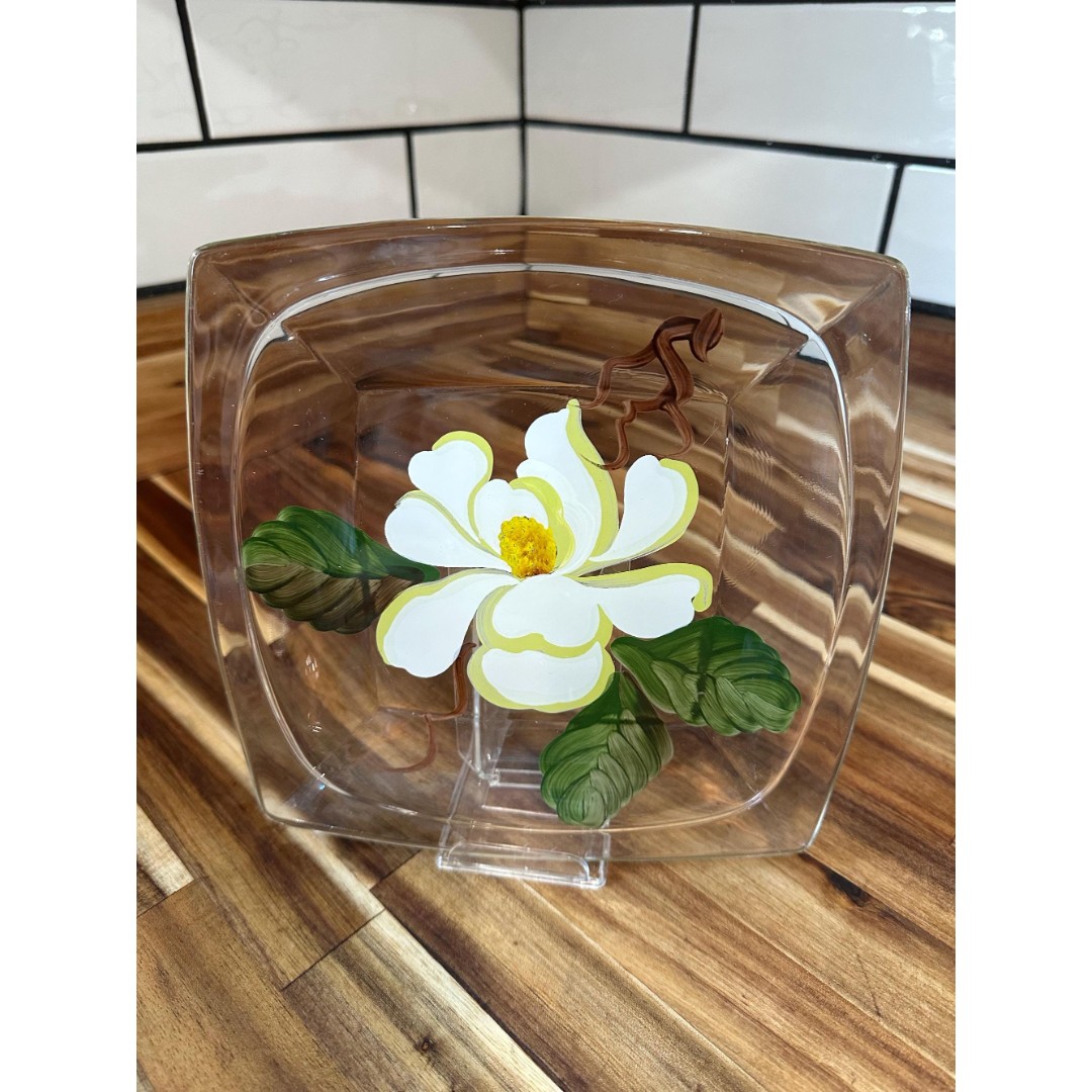 Bring a stunningly beautiful vintage touch to your tea time, dessert, or luncheon with this set of four hand painted Magnolia 8 x 3/4 Square Clear Glass Plates produced in the 1950s - 1970s by Hazel Atlas Glass Company