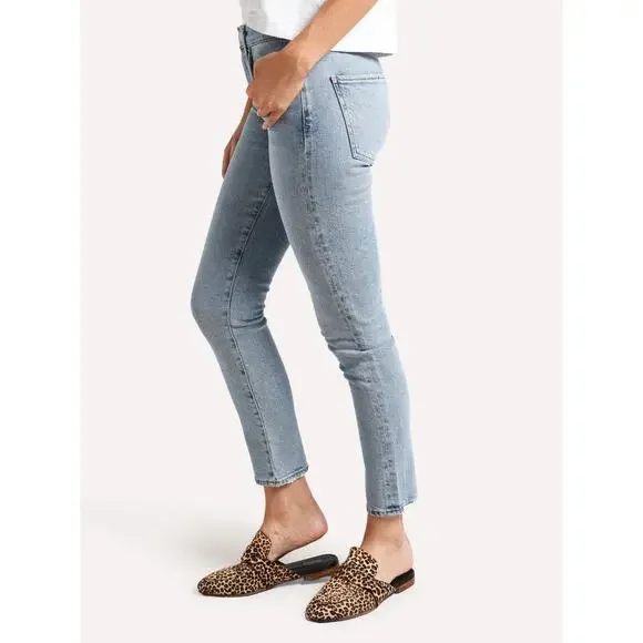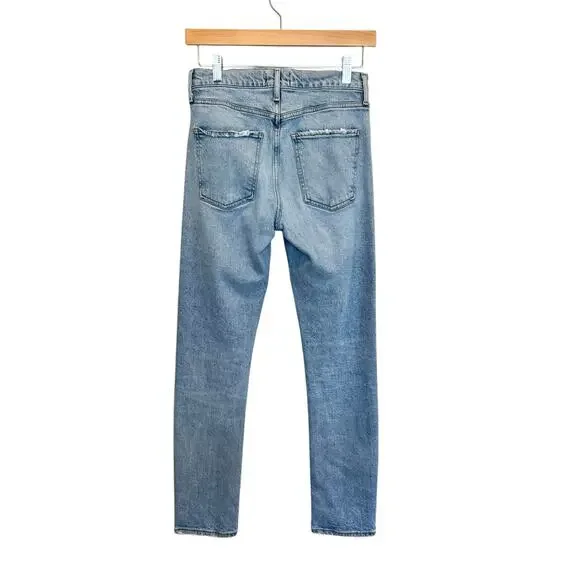 The Agolde Toni Mid Rise Straight Jean offers your denim collection a polished option for the season.Mid riseZip fly closureLight indigo washSubtle distressed details at pocket and hemStraight legFront rise: 9 3/4 in, Inseam: 27 in66% lyocell, 32% organic cotton, 2% recycled elastaneSize 26Excellent preowned conditionOffers welcome