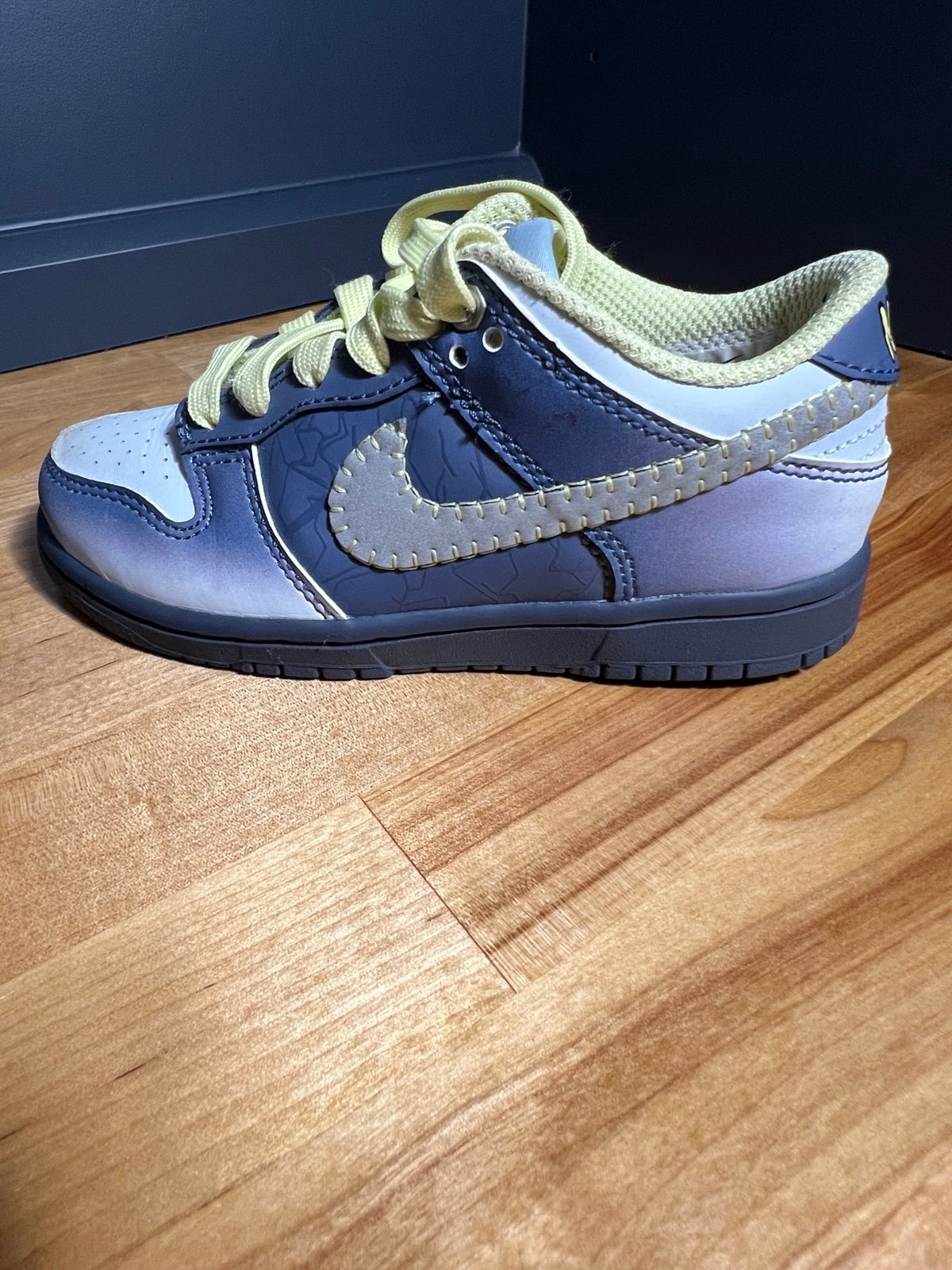 The Nike Dunk Low Halloween I Am Fearless Sneakers in size 11C (FQ8355-491) are a stylish and athletic shoe designed for kids. With a low top shaft style and blue colorway, these sneakers feature the iconic Nike Dunk silhouette and are part of the Nike Dunk product line. Perfect for both fashion and function, these sneakers are sure to make a statement whether on the playground or the basketball court.
