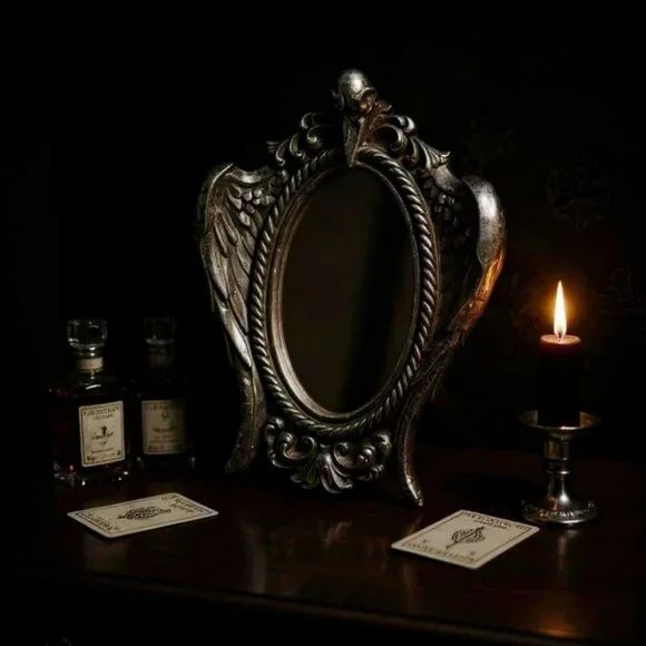 A tragic whisper of devotion etched in glass.This hauntingly beautiful mirror features a sculptural raven mid-flight, guiding a mourning soul through grief and memory.Inspired by gothic romance & literary lore, it evokes themes of eternal love, shadow work, & loss.Made of cold-cast resin with a glass mirror inset, it’s designed in England and arrives boutique-clean for your sacred space.🖤 Approx. Dimensions: 9.57" H x 7.72" W x 1.3" D🕊️ Sculpted raven on gothic resin frame🖤 Embodies themes of love, loss & transformation🧪 Made from durable resin with glass mirror inset📍 Designed in England | Boutique clean & new📦 Ready to gift or enshrine—ships with sacred intention🏷️ STYLE TAGS: #GothicWallArt #ShadowWorkDecor #AlchemyAesthetic💸 DEAD STOCK: $89 | Offers welcome & $65+ orders include a free Self-Love Gift Bag 🖤~ Since 2016 ~🌙 Curated with care and shipped with sacred intention from my moonlit boutique💫 First time on ? Use code MOONGODDESSEDGY for $10 off your first order🐾 Clean, smoke-free space with one very spoiled (but inventory-free) cat🌟 Trusted seller with 10k+ happy buyers across three shops🎉 5-Star Rated | Suggested User | Gold Ambassador II | 116+ Party Co-Host📦 Bundle your faves for exclusive discounts & Only 1 Shipping fee