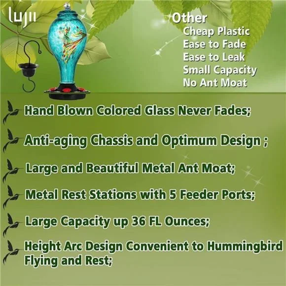 🧿ATTRACT MORE HUMMINGBIRDS: The bright color and style of the glass bottle make the hummingbird feeder more attractive for hummingbirds, 5 flower feeding ports for hummingbird to rest and drink🧿HANDMADE BLOWN GLASS: Each product is individually blown and hand-finished by skilled artisans. The pigment is embedded in two layers of glass and won't fade and damage🧿EASY TO CLEAN: This clear glass feeder is a breeze to clean, just unscrew the bottle from the base - it's that easy🧿EASY TO FILL NECTAR: Featuring clear glass, wide-mouth reservoir and two-part base makes seeing and refilling nectar simple🧿SEE THROUGH RESERVOIR: Easy viewing of the nectar levels through the colorful and translucent glass reservoir. Double layers colored glass bottle. Much sturdier and heavier. Never fade.
