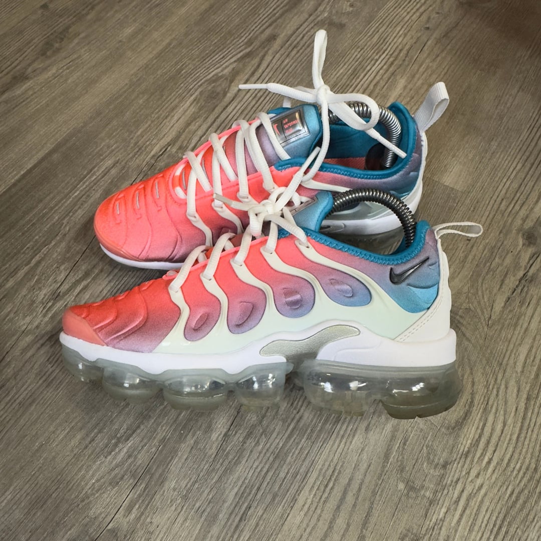 Nike Air VaporMax Plus Running Shoes in Mint Foam Lava Glow, women's size 6.5. These vibrant sneakers feature a unique color gradient from blue to pink (Mint Foam Lava Glow) on the upper, characteristic of the VaporMax Plus line. The innovative clear VaporMax sole provides lightweight cushioning and a distinctive look. In excellent used condition, with clear soles and minor signs of wear. Perfect for adding a pop of color to your athletic or streetwear wardrobe. Date of manufacture: 11/16/18.