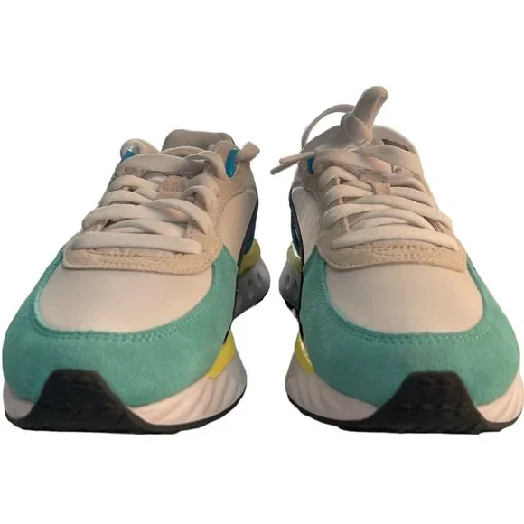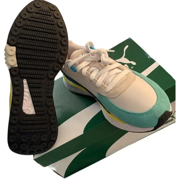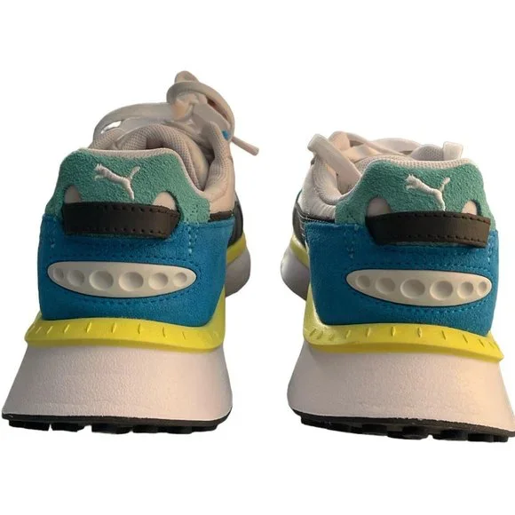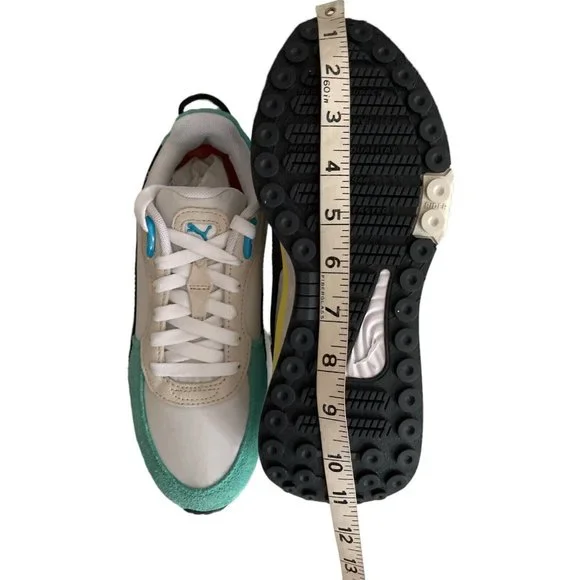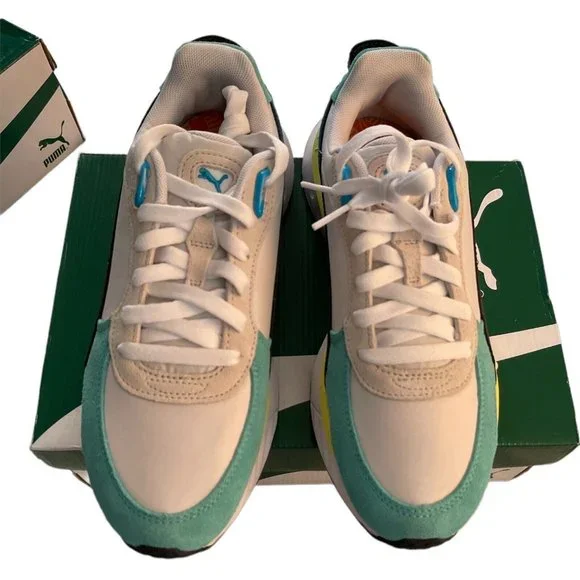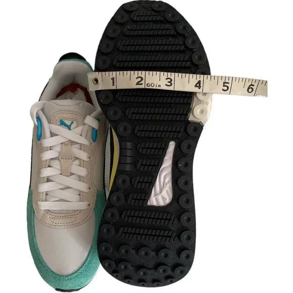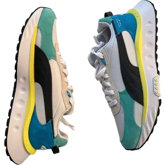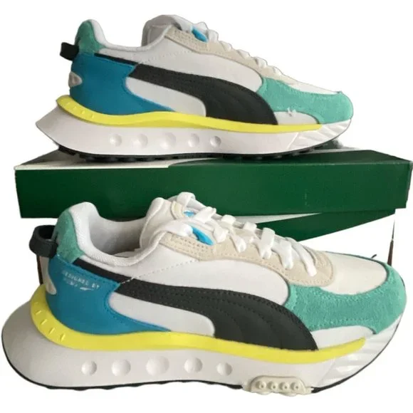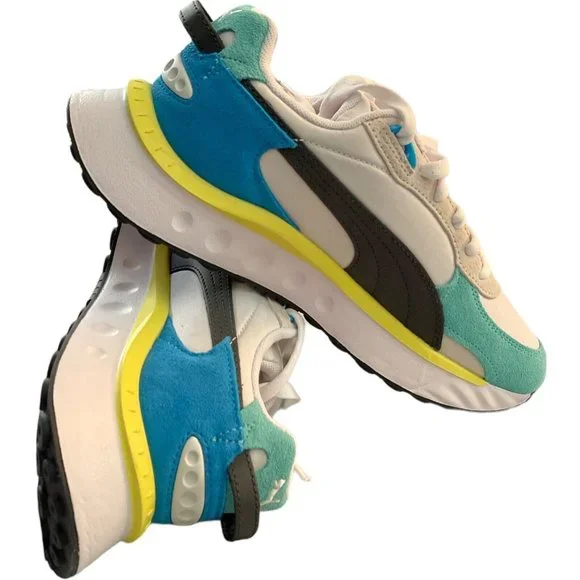PUMA Size 5C Wild Rider Rollin' Sneakers JR Elektro Aqua-Puma White.PUMA Wild Rider features:Nylon upper brings in comfort and durability.Suede overlays with a leather form stripe adds structure and a pop of chic style.Textile with lace closure provides extra comfort.Non-marked rubber outsole ensures superior traction and grip.
