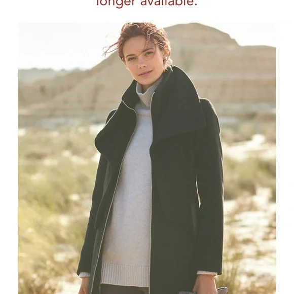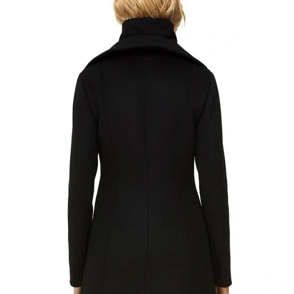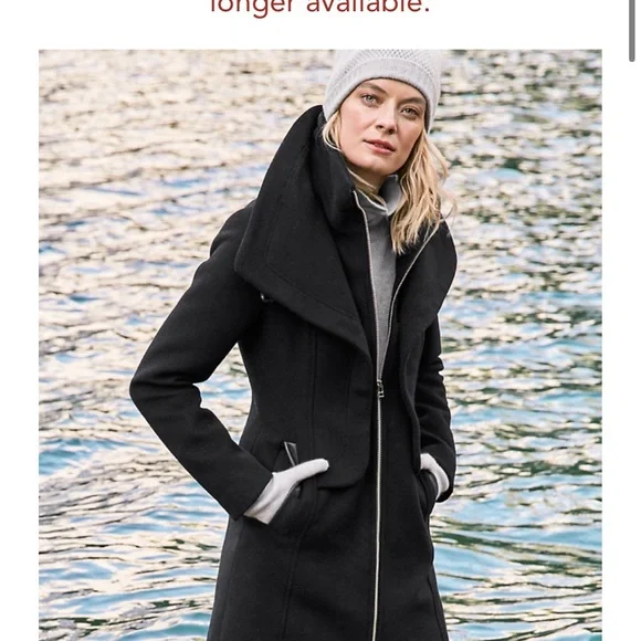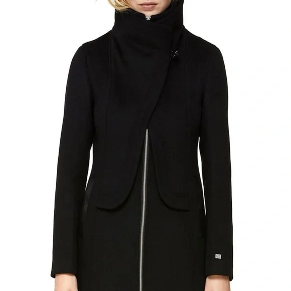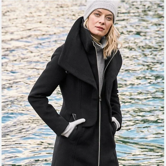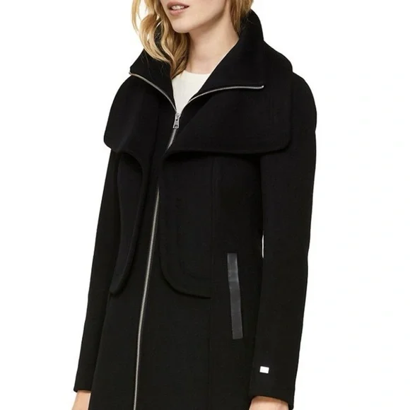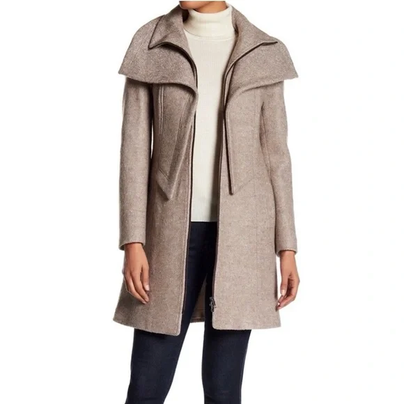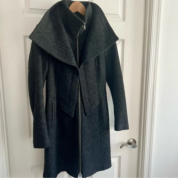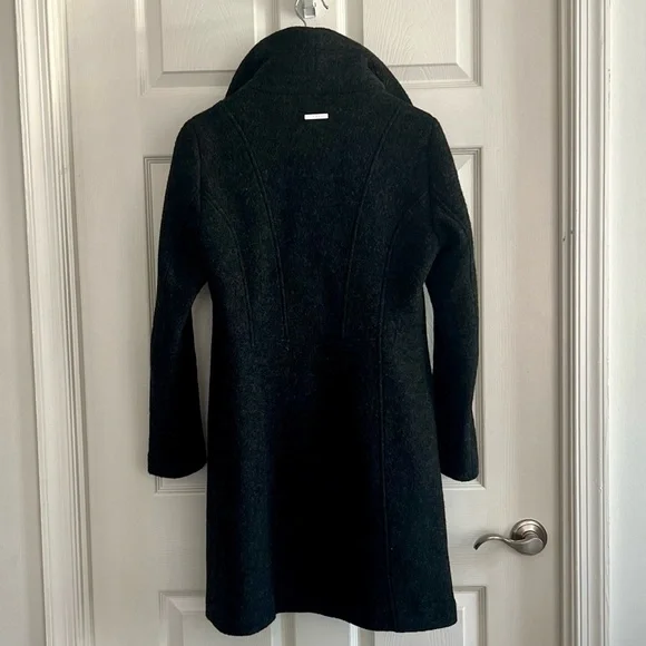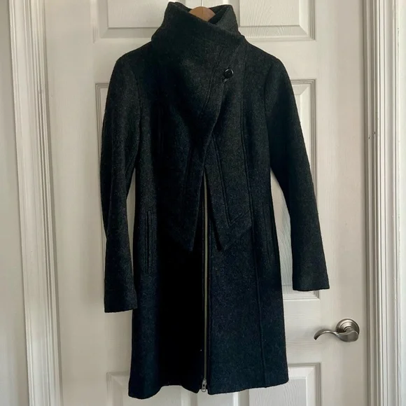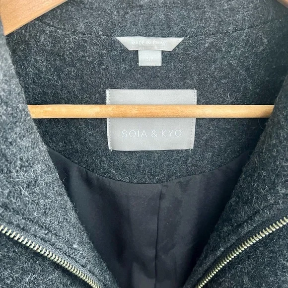 Terrifically tailored, this elegant coat is as good as new, with details including a full front zip and curvaceous hem. Cozy in a wool blend, with a dramatic lapel collar that becomes a funnel neck for scarf-like warmth. EXCELLENT pre-owned condition - only worn Twix. By Soia & KyoCharcoal GreyFittedAngled collar; funnel necklineLong sleevesZip closure, with loop-and-button collar closureWelt pockets - still stitchedScalloped hem3/4 lengthWool/poly/viscosePoly liningFlavie - Flavia
