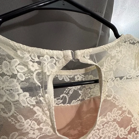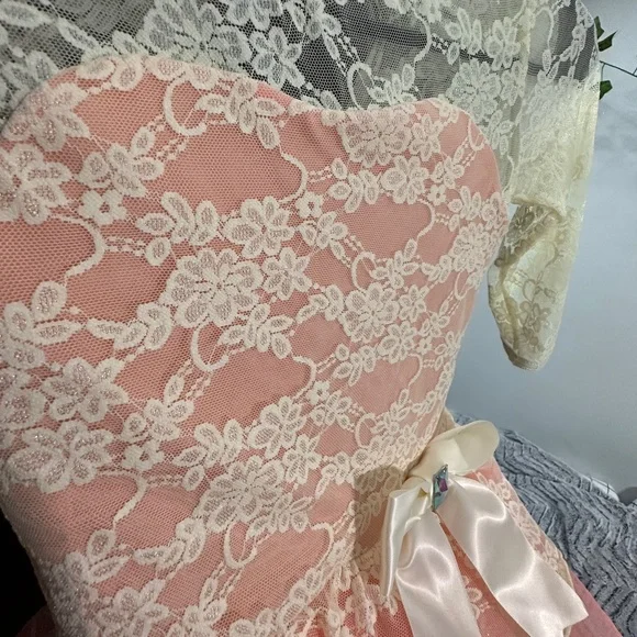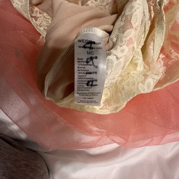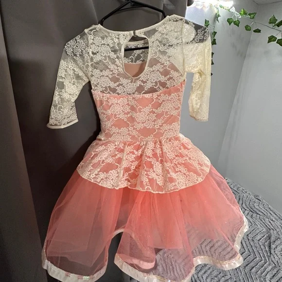 ONLY BEEN WORN ONCE on stage during recital Comes in a Medium Child color: PinkThe bodice of this dress is made of shiny spandex with a stretch floral lace overlay and 3/4 sleeves• Keyhole opening in back with a G- hook closure• The waist features an attached bow with rhinestone accent• Top skirt is made with a stretch floral lace overlay and glitter mist tulle and tricot underskirt with satin ribbon at the hem• Attached briefs